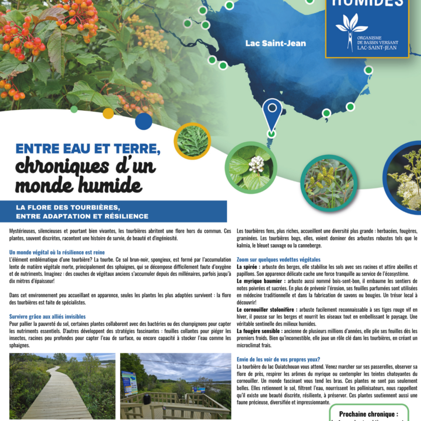 Ces chroniques élaborées dans le cadre de la mise en valeur de la tourbière du lac Ouiatchouan pour le projet de la Route des milieux humides, vous font découvrir l’importance de la tourbière, son rôle, sa biodiversité et ce que l’on peut y observer lors d’une visite.
